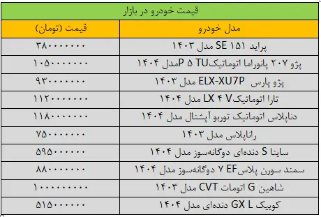 ریزش ۵ تا ۲۰ میلیون تومانی قیمت خودروهای داخلی | آخرین قیمت پراید، پژو، شاهین، سمند، دنا و کوییک + جدول